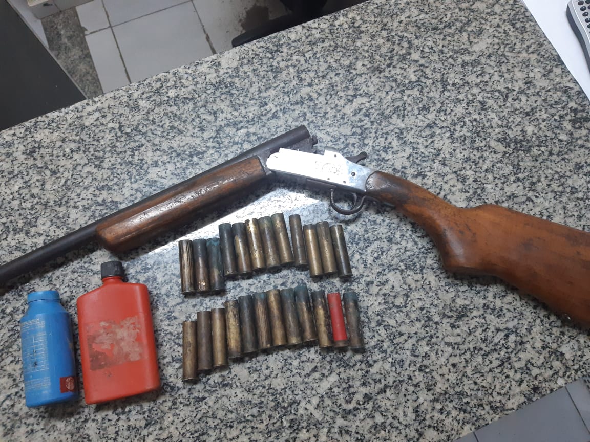 A mulher franqueou a entrada dos militares e atrás da geladeira foi localizada uma espingarda calibre 28, com um cartucho intacto e numeração suprimida, além de oito cartuchos carregados, 13 cartuchos vazios e três potes contendo pólvora.