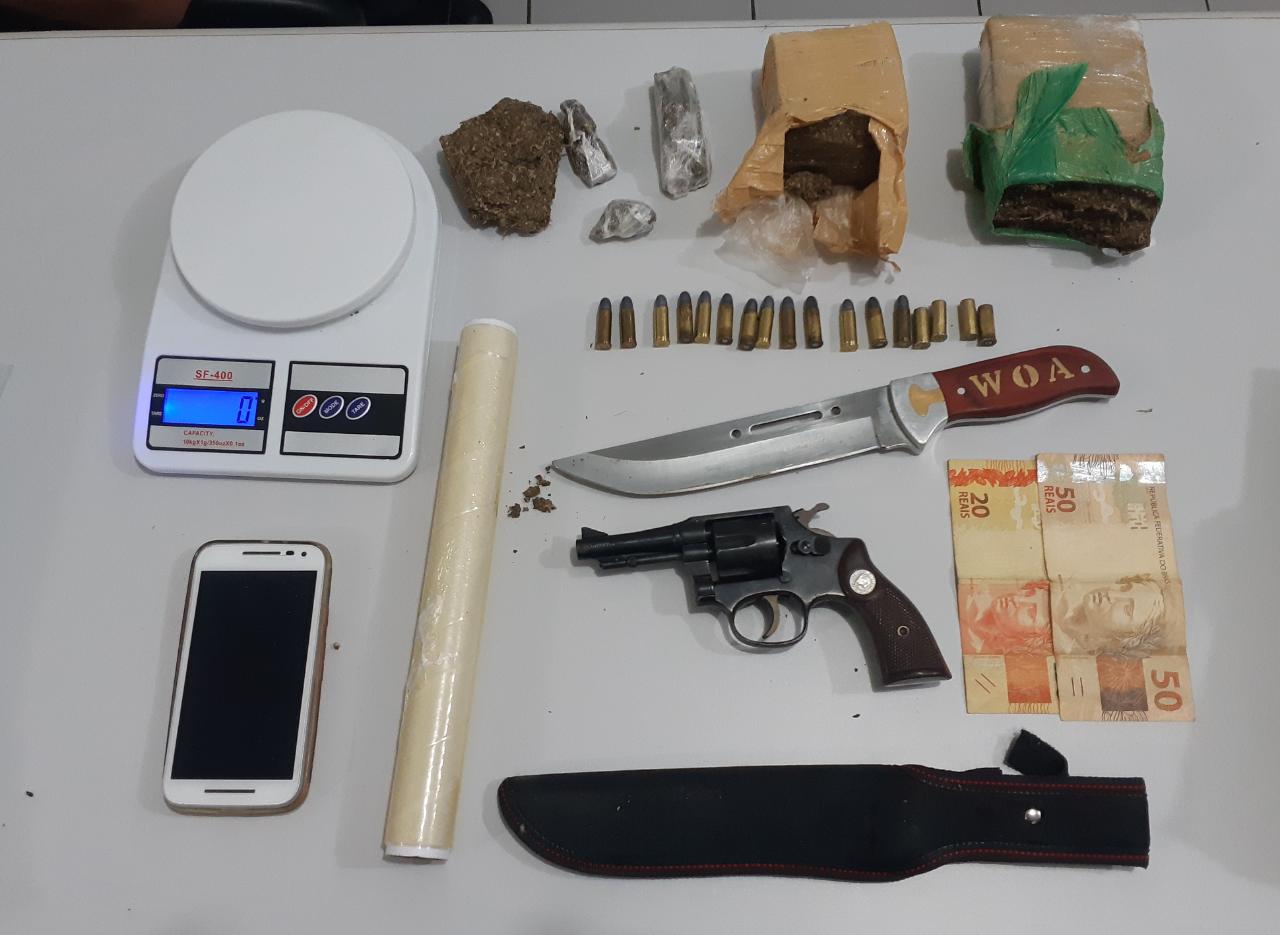 Arma, droga e outros materiais apreendidos pela Força Tática (Foto: Divulgação)