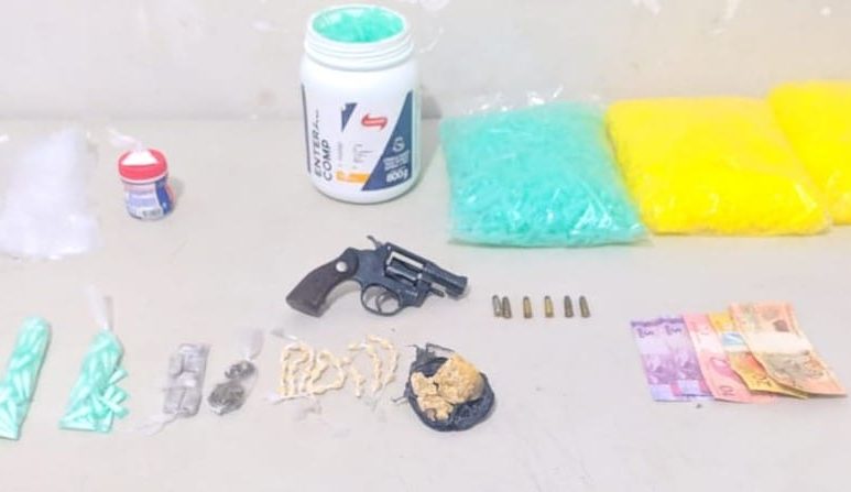 No local onde o homem estava, os policiais ainda encontraram, sobre uma mesa no quintal, sete porções de maconha, uma porção grande de crack, outras 38 da mesma droga já embaladas para a venda, uma pequena porção de cocaína, além de vários apetrechos para o preparo e embalo dos entorpecentes.