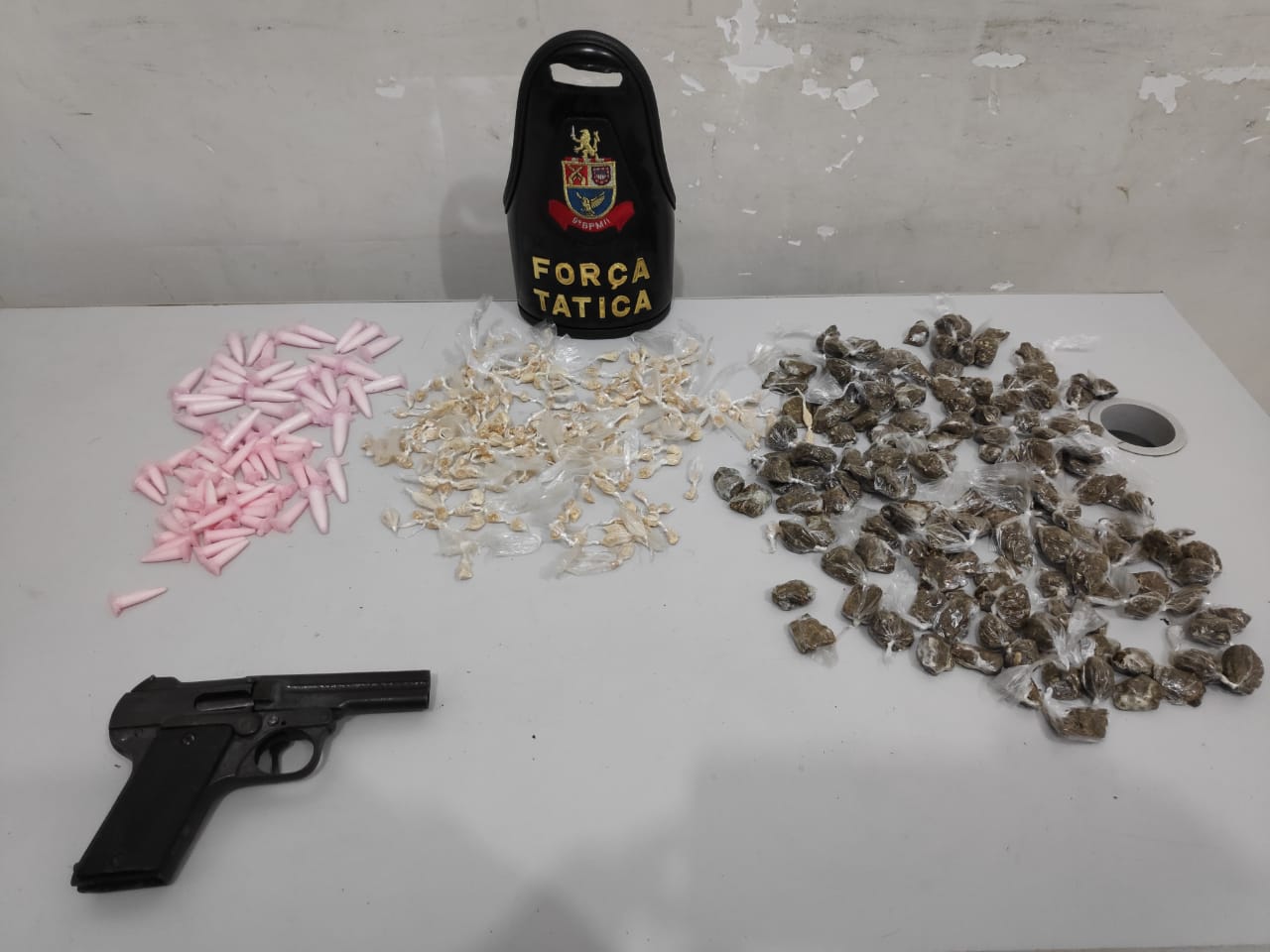 Foram apreendidos uma pistola calibre 765 com numeração suprimida, 150 porções de maconha, 81 pinos de cocaína, 247 pedras de crack e uma balança de precisão.
