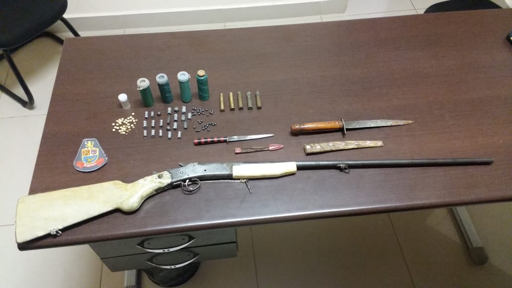 Em buscas no imóvel, os policiais encontraram a arma de fogo mencionado, munições e facas. Diante dos fatos, o autuado recebeu voz de prisão e foi conduzido até a Delegacia.