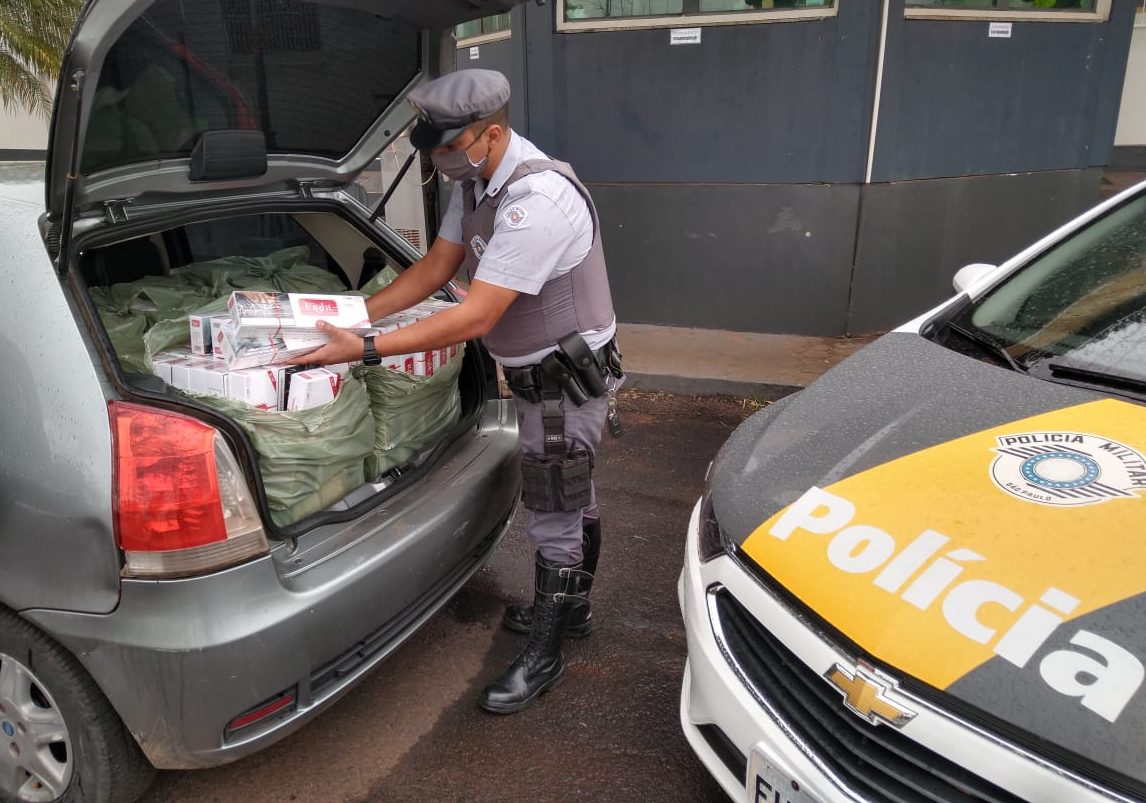 O condutor apresentou nervosismo fora do comum e os policiais realizaram busca no automóvel. Foram localizado 4.500 maços de cigarros sem nota fiscal, oriundos do Paraguai.