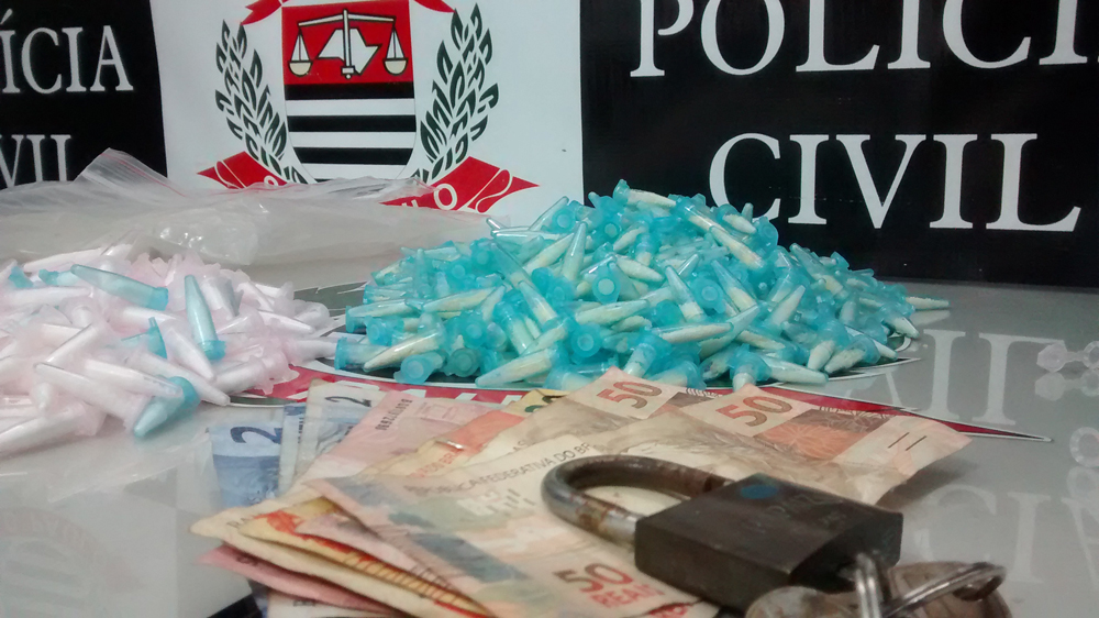 Carlos Eduardo, vulgo ‘Du’, tinha em suas mãos uma muca contendo 19 pinos com cocaína. Num dos quartos, foram localizados dois sacos plásticos vazios, do tipo que abrigam mil pinos plásticos.