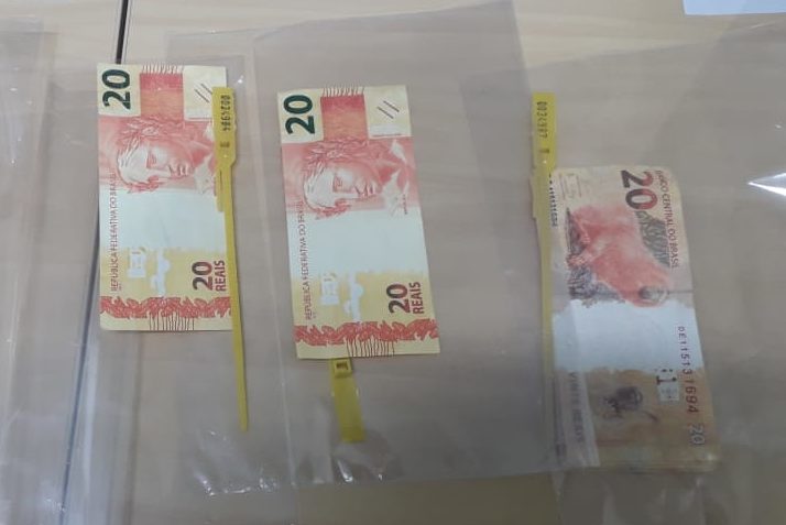 Durante a busca pessoal, foram localizadas em seus bolsos, várias notas de R$ 20 idênticas a que foi utilizada no estabelecimento comercial, totalizando R$ 160.