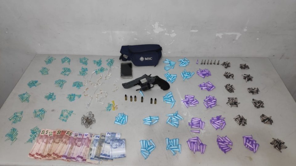 O carro foi perseguido e abordado, os PMs localizaram sob o banco do motorista, um revólver calibre 38, com seis munições intactas, numeração raspada, e no assoalho atrás do banco do motorista, debaixo de um cobertor, havia uma sacola plástica contendo 187  pinos com  cocaína, 208 pinos com crack, 39 porções de crack e 12 porções de maconha.