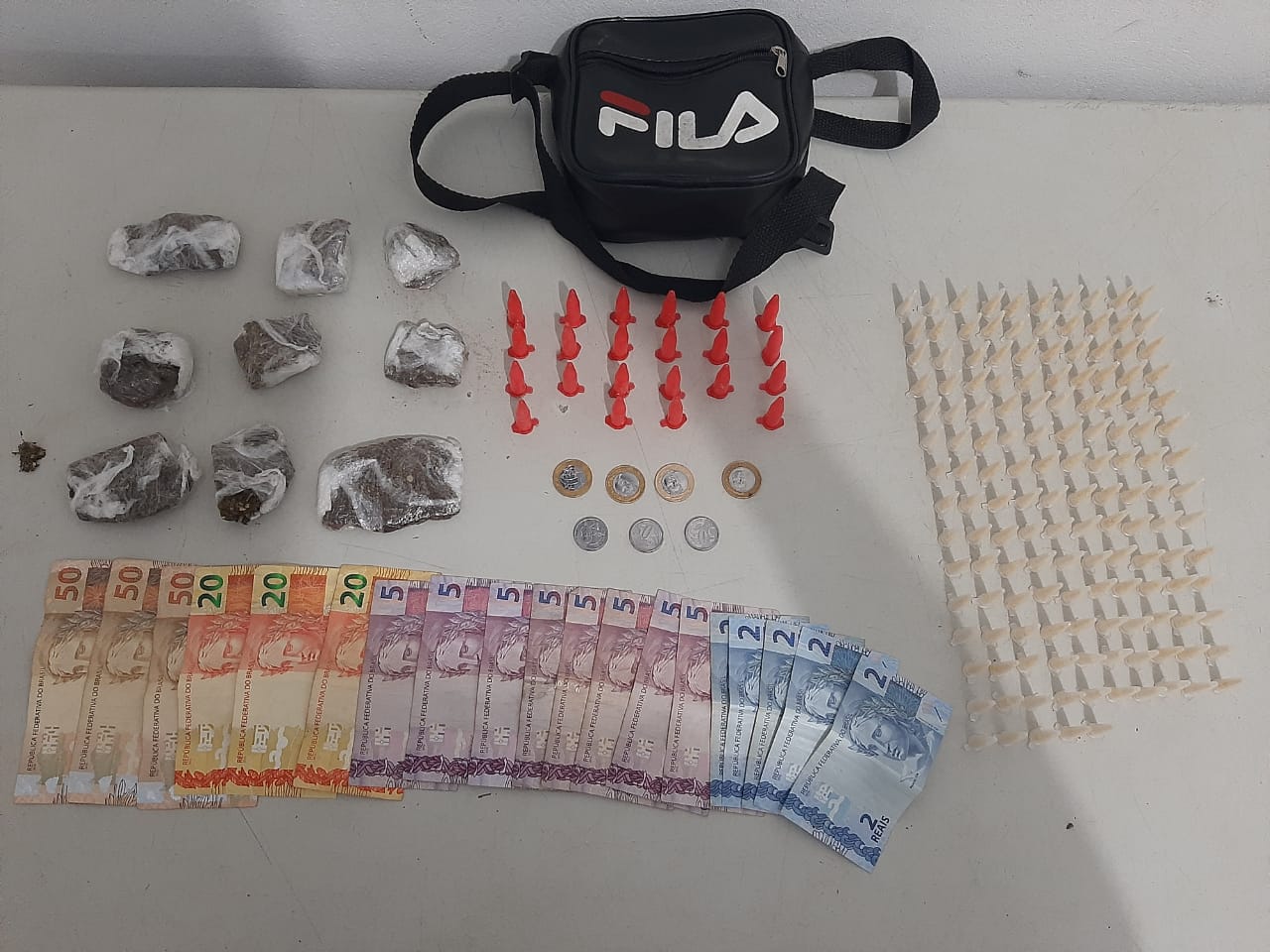 No interior da pochete havia 145 pinos com crack, 22 pinos com cocaína e nove porções de maconha. No bolso da calça tinha a quantia de R$ 265,50.
