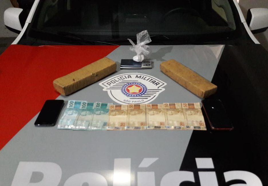 No veículo foram encontrados dois celulares, R$ 550, uma balança de precisão, 29 gramas de cocaína e dois tabletes de maconha.
