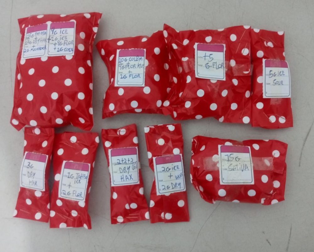 Durante a revista pessoal, nada de ilícito foi localizado. Já no guarda-volumes da motocicleta, foram encontradas oito porções de maconha, 12 de haxixe e uma de cocaína, que estavam acondicionadas em embalagens para presentes.
