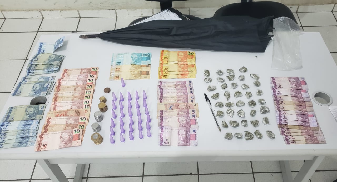 Os policiais fizeram a abordagem e encontraram no bolso do desempregado R$ 603,75. No interior do guarda-chuva havia 39 porções de maconha e 31 pinos com cocaína.