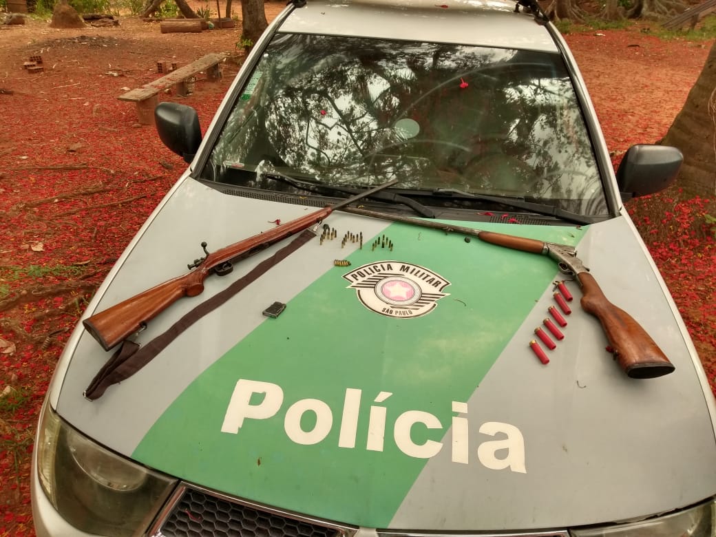 A Polícia Ambiental recebeu denúncia de prática de caça pelo bairro Jurema e localizou em uma propriedade rural duas espingardas sendo uma calibre 22 e uma calibre 28, além de diversas munições.