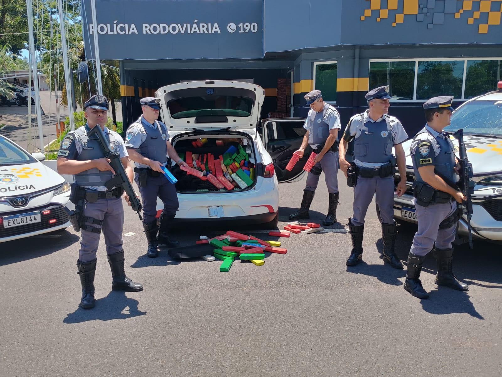 A abordagem do Fiat Argo Drive, com placas de Bauru, aconteceu por volta das 9h30. Durante a inspeção, os policiais localizaram 811 tabletes de maconha, que passou dos 620 quilos, além de dois pacotes de cocaína com quase um quilo e dois de haxixe, com mais de 300 gramas.