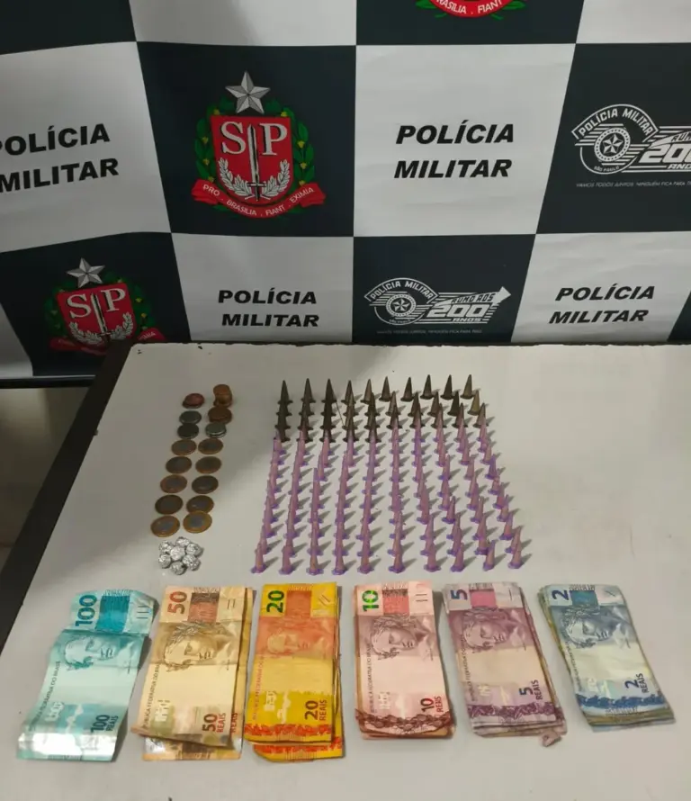 Com ele, os policiais localizaram uma sacola plástica contendo 35 tubos com cocaína, 102 de crack e R$ 935,35 em dinheiro.