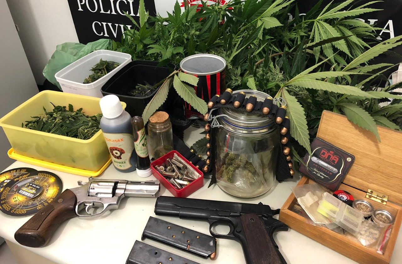 Em buscas na chácara, foram localizadas e apreendidas uma pistola calibre 45, vários cartuchos intactos e 60 cápsulas deflagradas, além de um revólver calibre 38 também com vários cartuchos, dois catálogos referentes ao cultivo de maconha, dois comprimidos de ecstasy, três selos de LSD, além de um pote com várias porções fragmentadas da erva, uma caixa com sementes da droga e uma balança de precisão.
