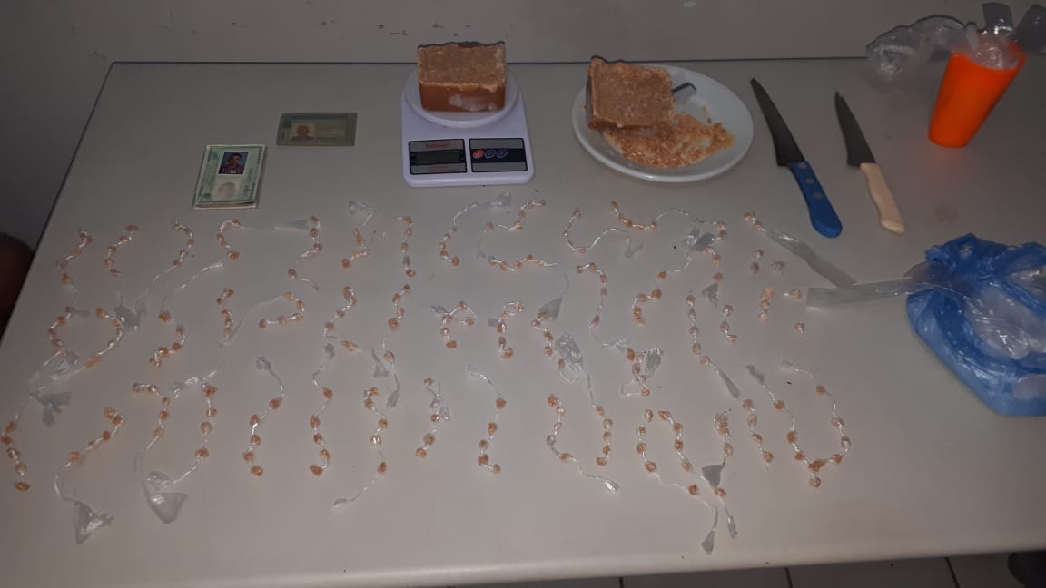 O homem foi acompanhado e detido. Na sacola havia 230 porções de crack. Os policiais se deslocaram até a residência dele e localizaram mais duas pedras da mesma droga, uma balança de precisão, duas facas e sacos plásticos usados para embalar o entorpecente.