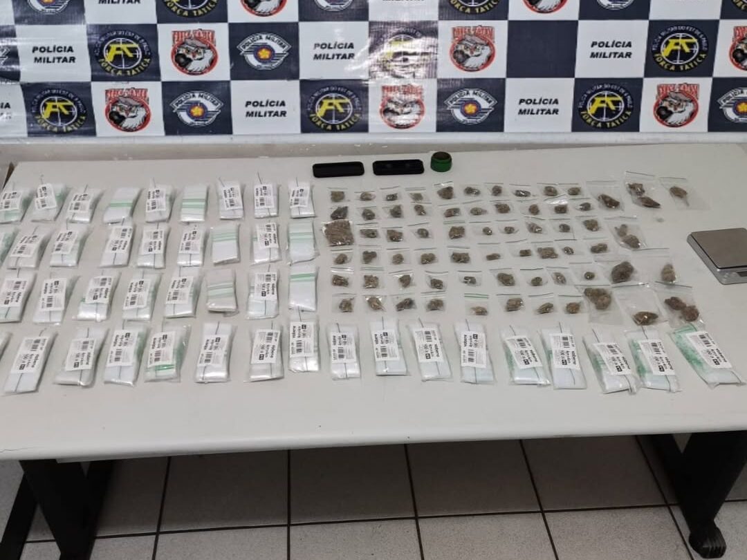 Durante a batida, ao perceber a presença de policiais militares, o homem tentou se desfazer de uma mochila, a jogando em um arbusto próximo. Ele foi revistado e a bolsa recuperada.
