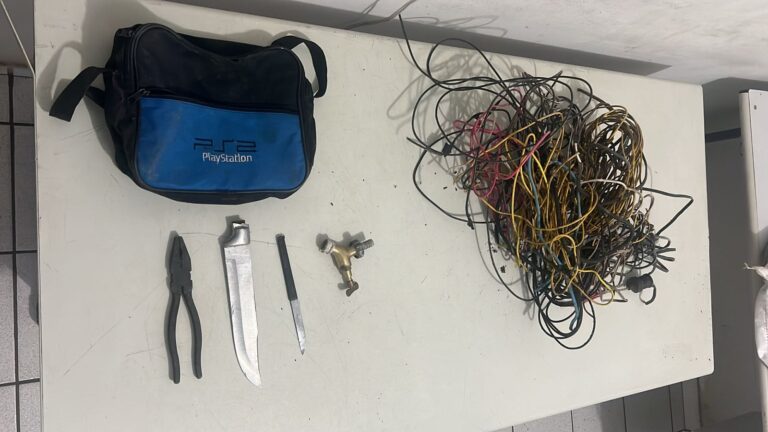 Durante a abordagem, foram apreendidos cerca de três quilos de fios e cabos de cobre, além de um alicate, duas facas — uma de cozinha e outra lâmina grande sem cabo — e uma bolsa. Segundo a polícia, os materiais teriam sido utilizados na tentativa de furto. Todo o material foi lacrado e apreendido.