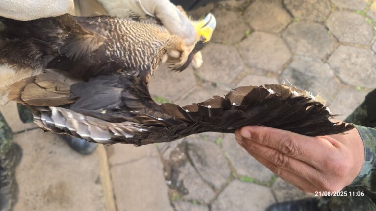 Durante a inspeção, os policiais constataram mutilações nas asas do carcará, resultado de cortes que impedem completamente o voo, caracterizando grave quadro de abuso e sofrimento.
