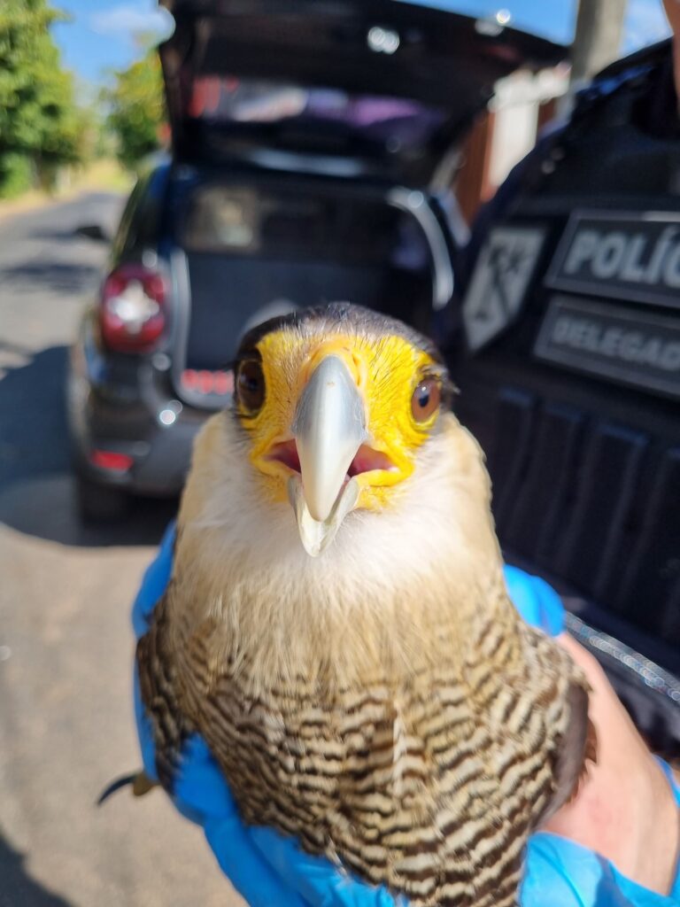 A Polícia Ambiental foi acionada, compareceu à delegacia, apreendeu o animal e lavrou autos de infração. A ave foi encaminhada para atendimento veterinário especializado.