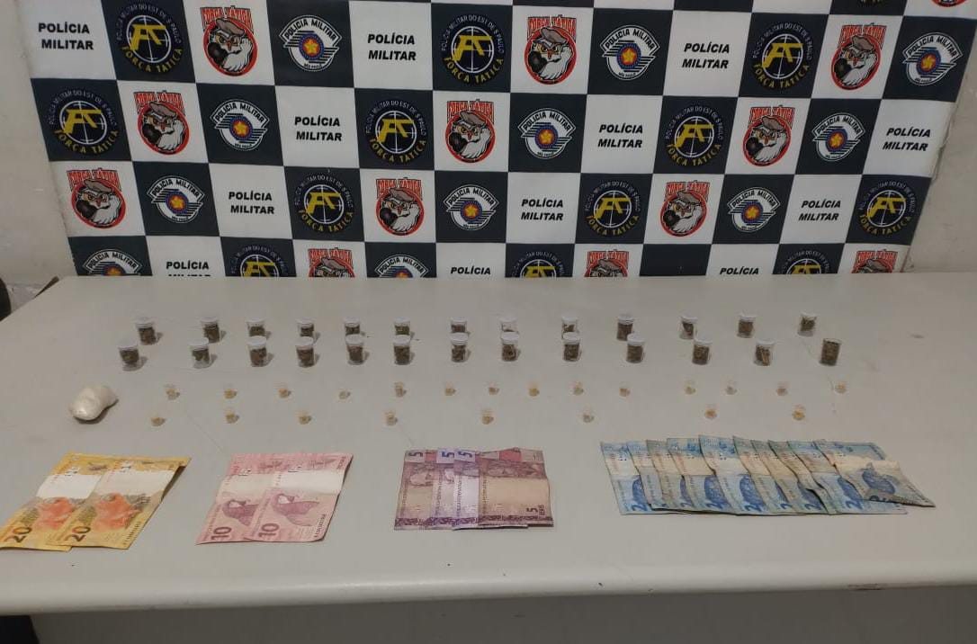 Durante a abordagem e busca pessoal, os policiais encontraram com o homem 31,34 gramas de cocaína, 106,92 gramas de maconha, divididos em 26 porções, e 17,96g de crack. Os entorpecentes estavam fracionados em embalagens individuais. Também foi encontrada a quantia de R$ 100.