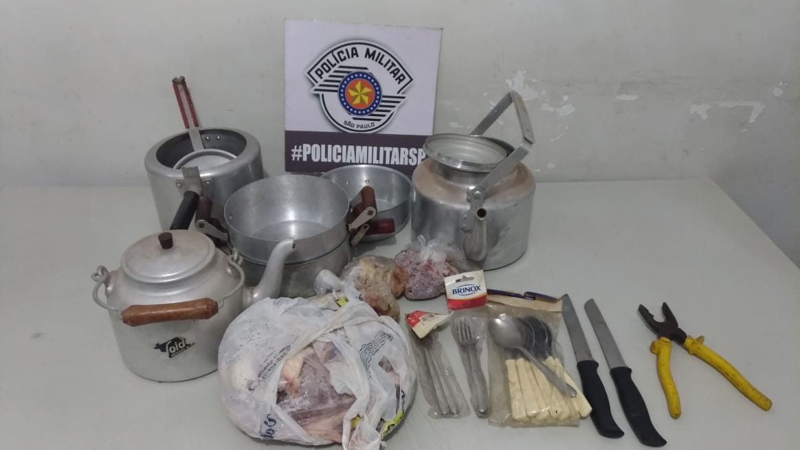 Ainda conforme a polícia em sua ficha criminal consta a prática de furto. Foram recuperadas panelas, talheres, carnes, bebidas e ferramentas furtadas.
