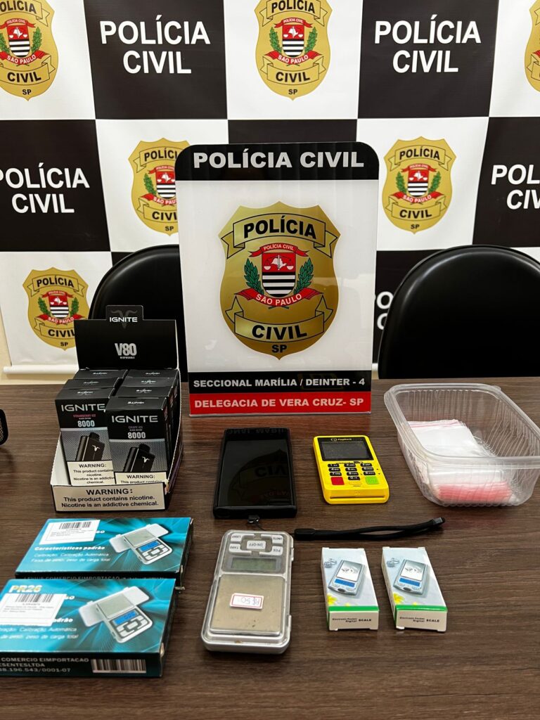 A Polícia Civil de Vera Cruz, com apoio de agentes da cidade de Garça, prendeu em flagrante um homem de 24 anos, durante o cumprimento de mandado de busca e apreensão na manhã desta quinta-feira (13). A operação teve ainda outros mandados e investiga conexões do tráfico e venda de produtos clandestinos de tabacaria.