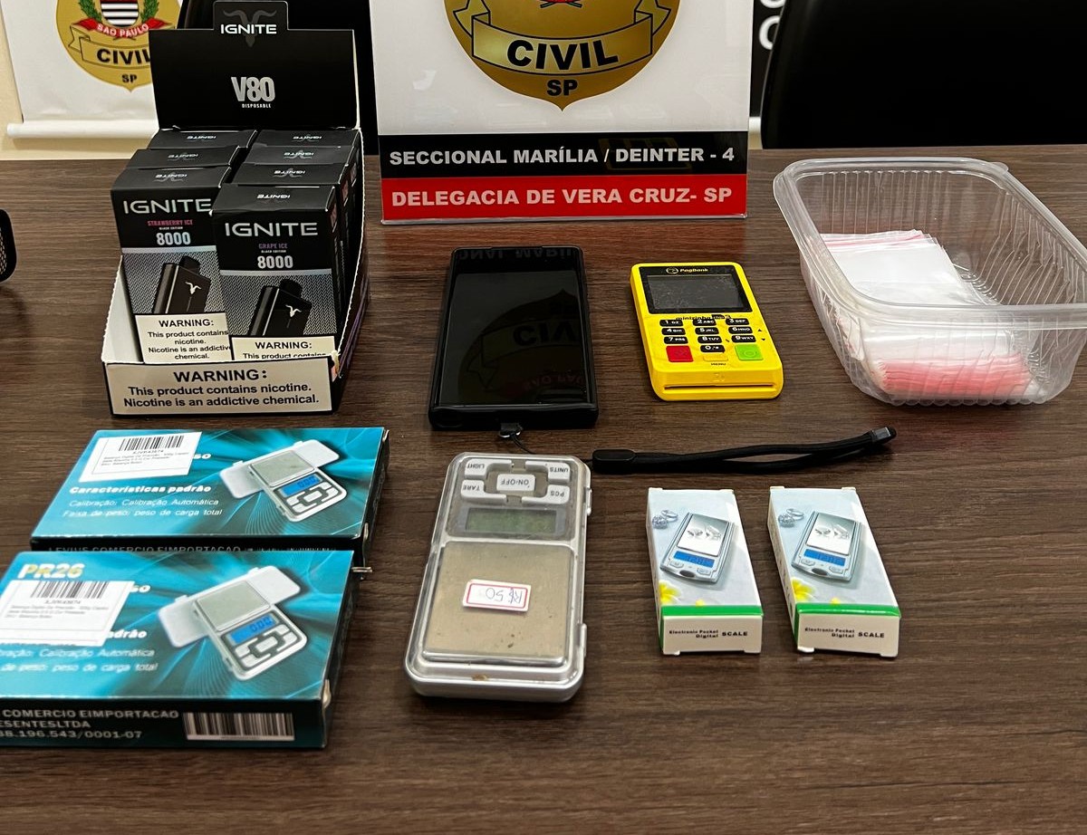 A Polícia Civil de Vera Cruz, com apoio de agentes da cidade de Garça, prendeu em flagrante um homem de 24 anos, durante o cumprimento de mandado de busca e apreensão na manhã desta quinta-feira (13). A operação teve ainda outros mandados e investiga conexões do tráfico e venda de produtos clandestinos de tabacaria.