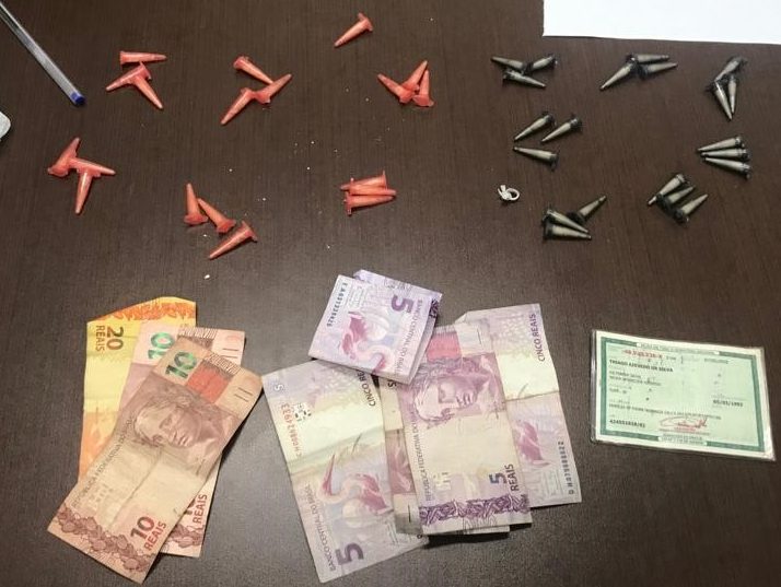 “No interior do imóvel encontramos o suspeito, perguntamos a ele sobre a moto ele contou várias histórias diferentes, realizamos buscas em seu quarto onde encontramos as chaves da moto e um capacete. Dentro de uma cômoda localizamos R$65, 19 pinos de crack e 21 pinos de cocaína”, notificou a PM.