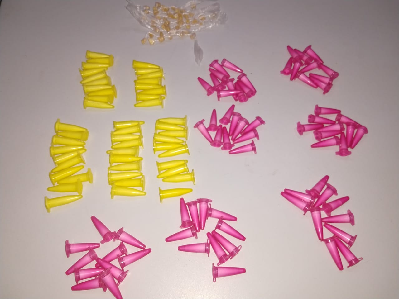Em revista pessoal nada ilícito foi encontrado, mas em buscas no local foram encontrados 118 pinos com cocaína, sendo 48 microtubos grandes e 70 pequenos, e 45 porções de crack.