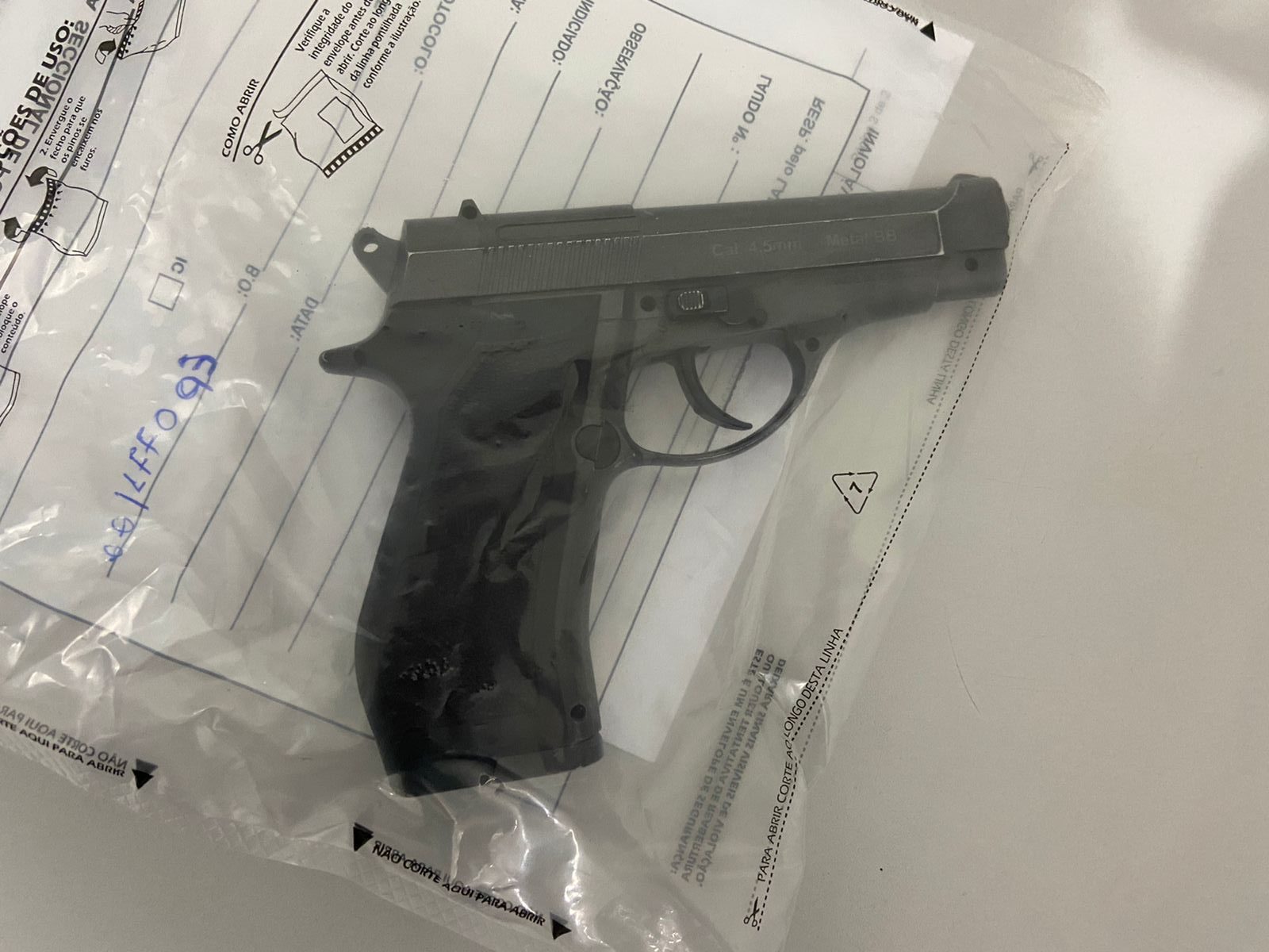 O homem foi abordado e dentro da sacola estava a arma de brinquedo. Questionado, o acusado disse que usava o objeto no sítio.