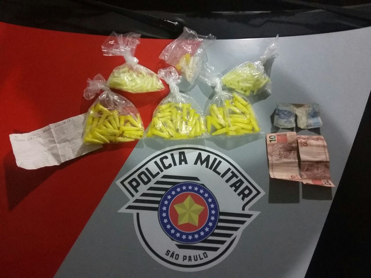 Ao perceber os militares, o indivíduo que recebia o dinheiro saiu correndo e durante a fuga jogou uma sacola no telhado de um imóvel. Ele acabou detido nas proximidades e descobriu-se que ele havia dispensado 103 pinos com cocaína e 11 com crack.