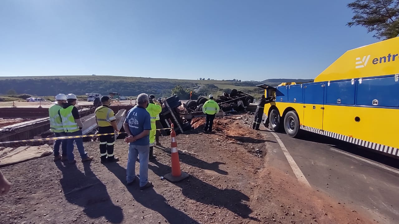 A rodovia, que está em obras de duplicação, teve o trânsito paralisado. O acidente aconteceu com uma carreta que estava carregada com pedras. O veículo capotou e o motorista ficou preso nas ferragens, sob o transporte.