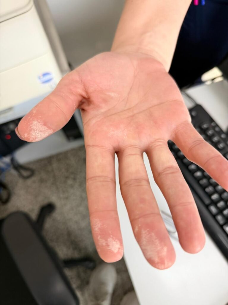 Ao abrir o recipiente, profissionais de saúde identificaram um “odor fétido” no líquido. Uma enfermeira que teve contato com a substância — molhou a ponta do dedo — relatou sensação de ardência na pele. Os dedos apresentaram aspecto semelhante a queimaduras, conforme registrado em fotos.
