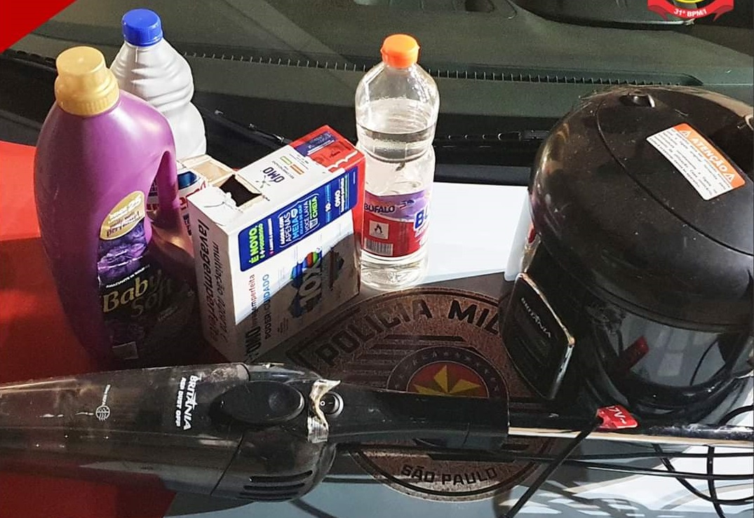 Ao chegarem no local, os policiais encontraram o ladrão escondido debaixo do telhado da casa vizinha. Foram recuperados produtos de limpeza e eletrodomésticos que tinham sido furtados.