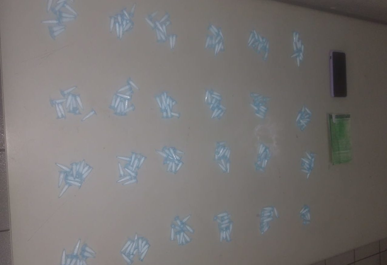 O motorista foi perseguido e abordado. No automóvel foi localizado um saco plástico contendo 235 pinos com cocaína.