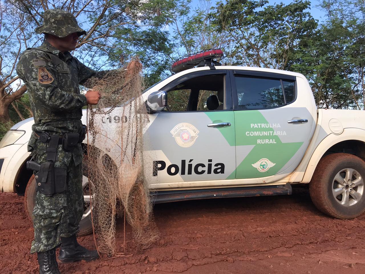 Segundo a Polícia Ambiental, durante patrulhamento rural a equipe surpreendeu os três indivíduos realizando pesca predatória mediante utilização de petrecho não permitido (tarrafa).