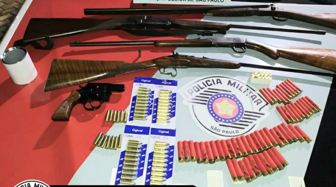Em busca veicular foram encontradas e apreendidas três armas de fogo, uma espingarda calibre 36, um rifle calibre 22 e um revólver calibre 38 com numeração suprimida, carregado com cinco munições intactas, além de outras oito munições intactas do mesmo calibre, 34 munições intactas de calibre 36, 11 munições intactas de calibre 22, duas munições deflagradas de calibre 44, duas munições deflagradas de calibre 36 e uma munição deflagrada de calibre 38.