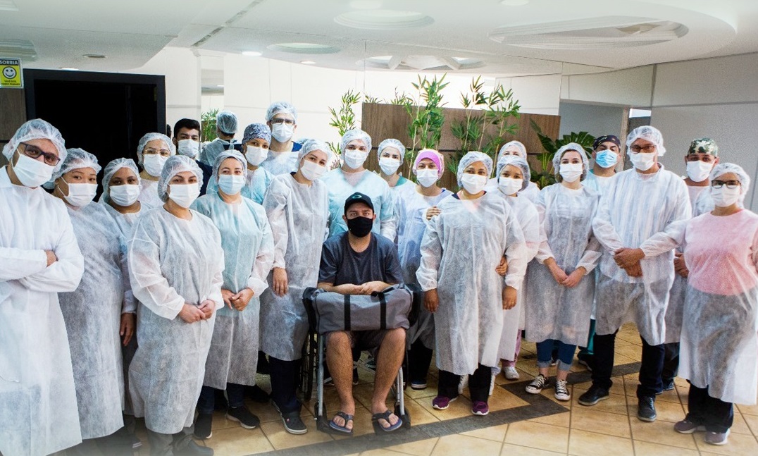 O último paciente do Hospital Covid-19 a receber alta foi Mateus Luan Fernando, de 27 anos. A equipe do Hospital se reuniu para se despedir, em um momento emocionante para todos.