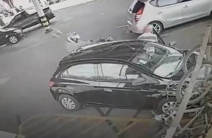 A vítima é empurrada pelo assaltante duas vezes e numa delas cai no chão. Mesmo assim, o idoso tenta perseguir o motociclista, que foge com um malote.