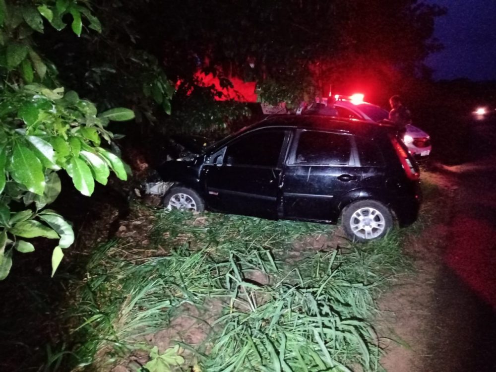 A Polícia Militar foi acionada para atender ocorrência de acidente de trânsito. No local, um veículo Ford Fiesta tinha se chocado contra uma árvore.
