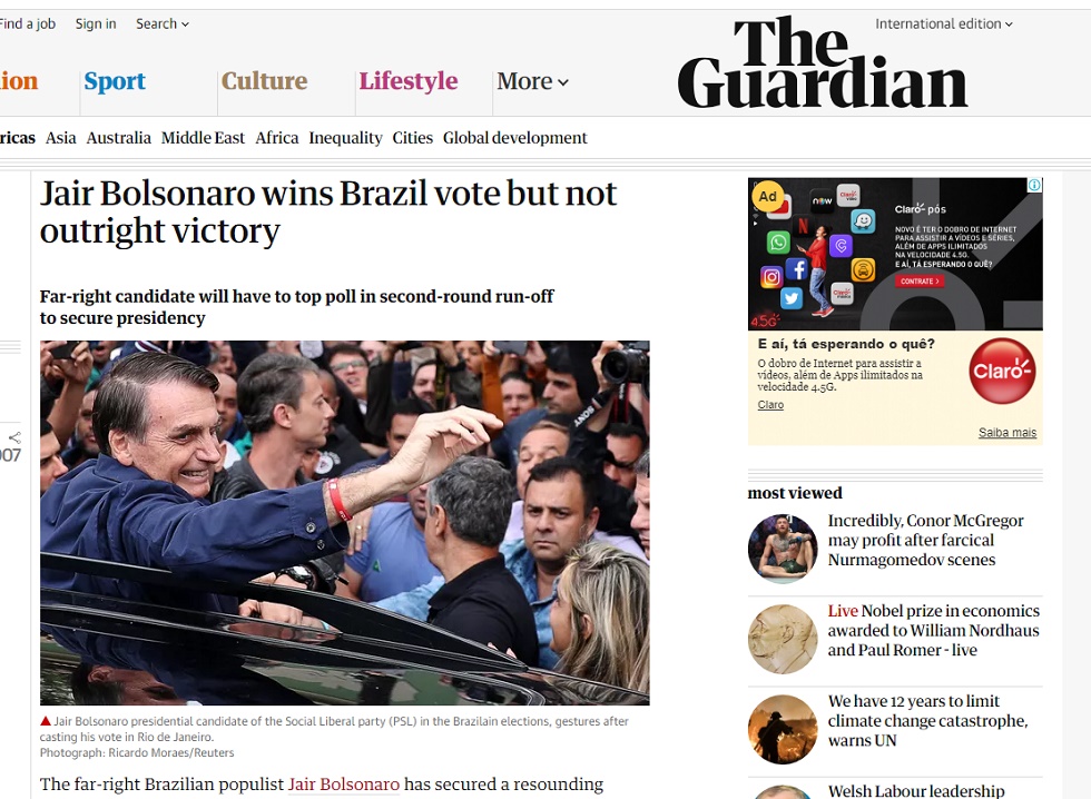 No Reino Unido, The Guardian destaca que haverá segundo turno e aponta em análise que apenas uma grande coalizão poderia provocar uma reviravolta favorável a Haddad. Na Espanha, El País aponta o “claro triunfo” de Bolsonaro e diz que os evangélicos brasileiros “se convertem à ultradireita”. Em análise, o diário afirma ainda que “a democracia recua” no País.