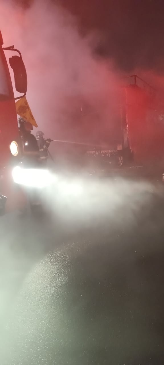 As chamas atingiram uma pequena loja de assistência técnica para celulares, instalada em um contêiner, e se propagaram para um veículo de propriedade do responsável pelo estabelecimento, que estava estacionado ao lado.