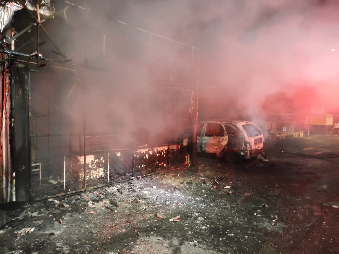 As chamas atingiram uma pequena loja de assistência técnica para celulares, instalada em um contêiner, e se propagaram para um veículo de propriedade do responsável pelo estabelecimento, que estava estacionado ao lado.