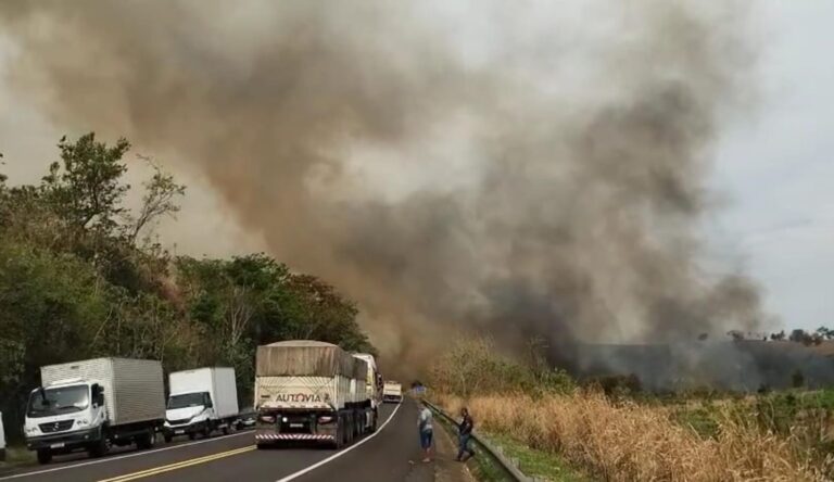 Um incêndio de grandes proporções em uma área de vegetação às margens da rodovia José Bassil Dower (SP-421) interditou o trecho entre Marília e Oscar Bressane. A fumaça intensa reduziu a visibilidade e obrigou motoristas a parar no local.