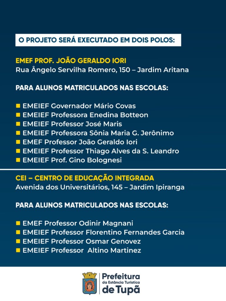 O segundo polo é o Centro de Educação Integrada (CEI), na avenida do Universitário, 145, no Jardim Ipiranga, que atenderá estudantes das Emef Professor Odinir Magnani, Emeief Professor Florentino Fernandes Garcia, Professor Osmar Genovez e Professor Altino Martinez.