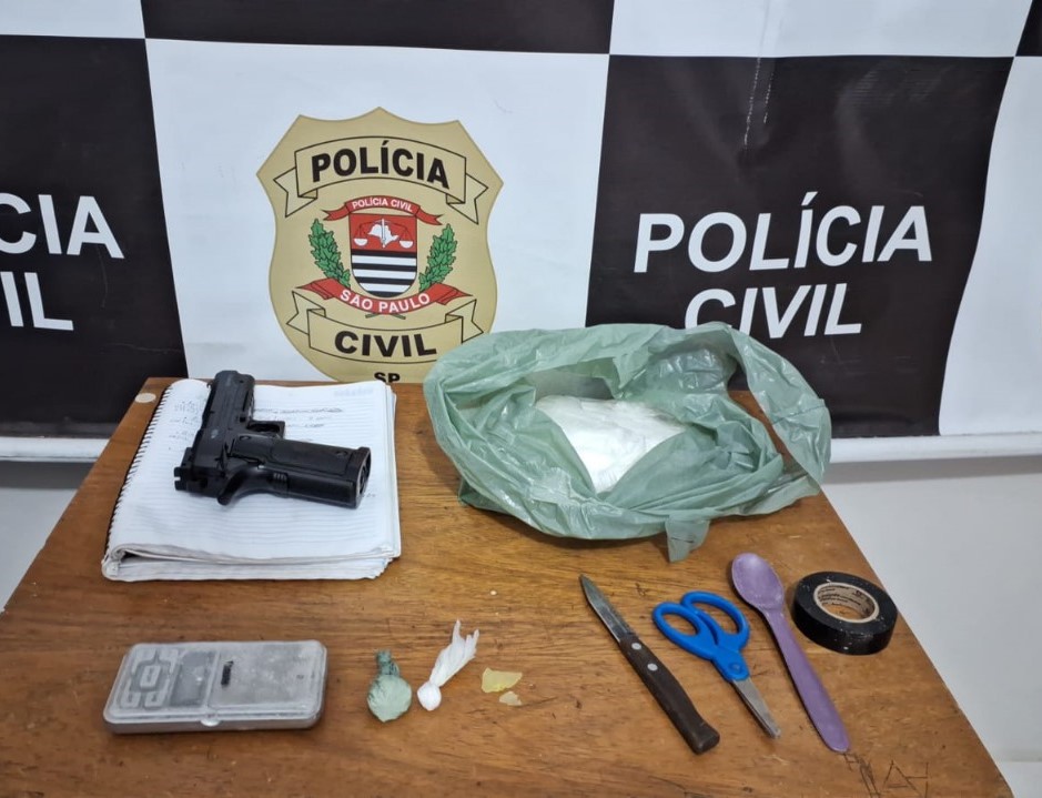 Durante a busca, foram encontradas porções de uma substância semelhante à cocaína, além de anotações relacionadas ao tráfico, uma balança de precisão e um simulacro de pistola. Todo o material foi apreendido.