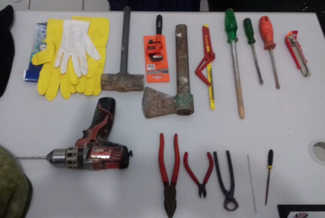 Uma mochila, duas luvas, um guarda sol, três alicates, marreta, serrote, chave de cano, chave falsa (mixa), estilete, garrafa térmica e uma furadeira portátil foram apreendidos pela polícia.