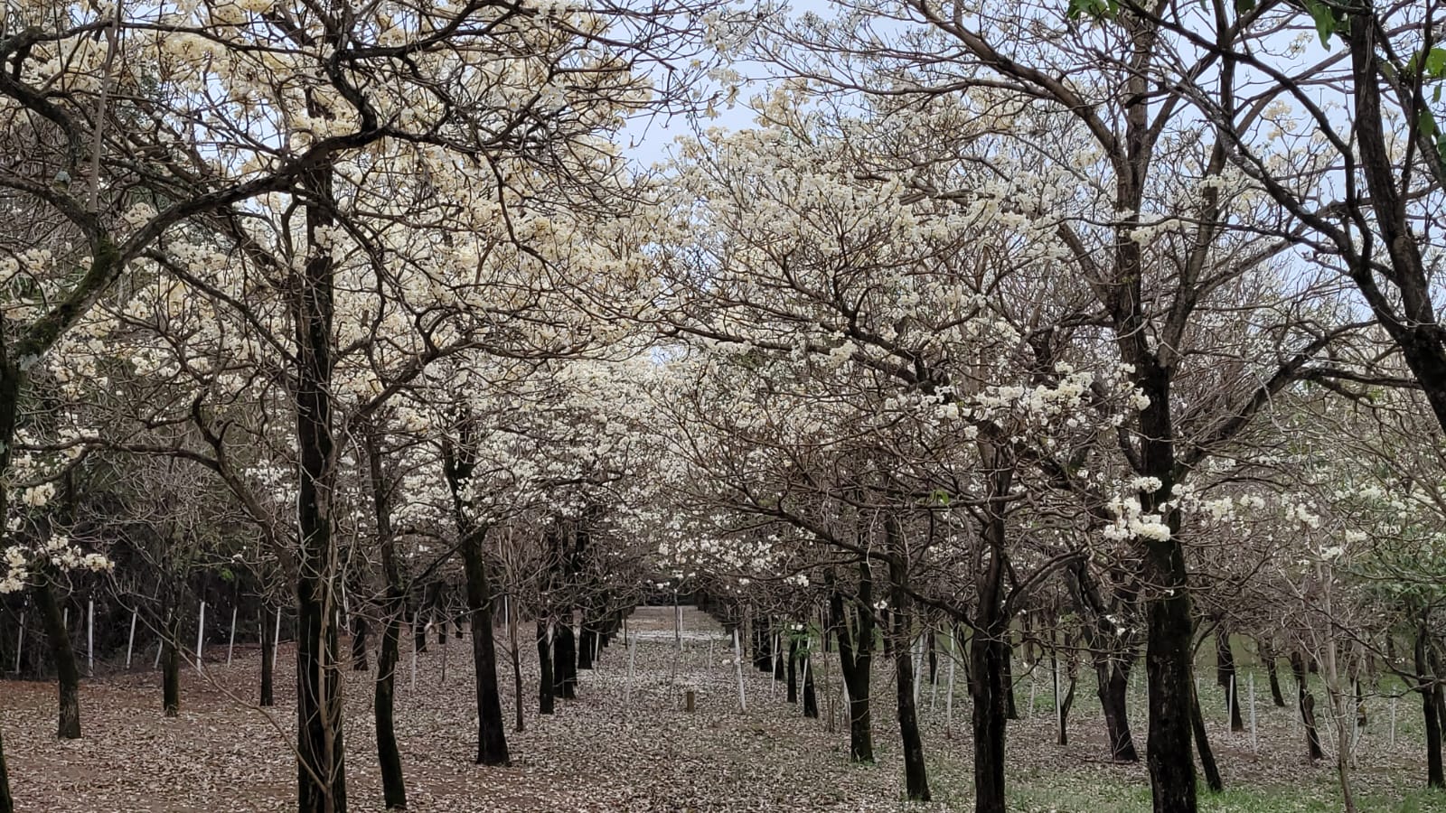 Ipês brancos floridos no Bosque Municipal de Marília (Foto: Alcyr Netto/Marília Notícia)