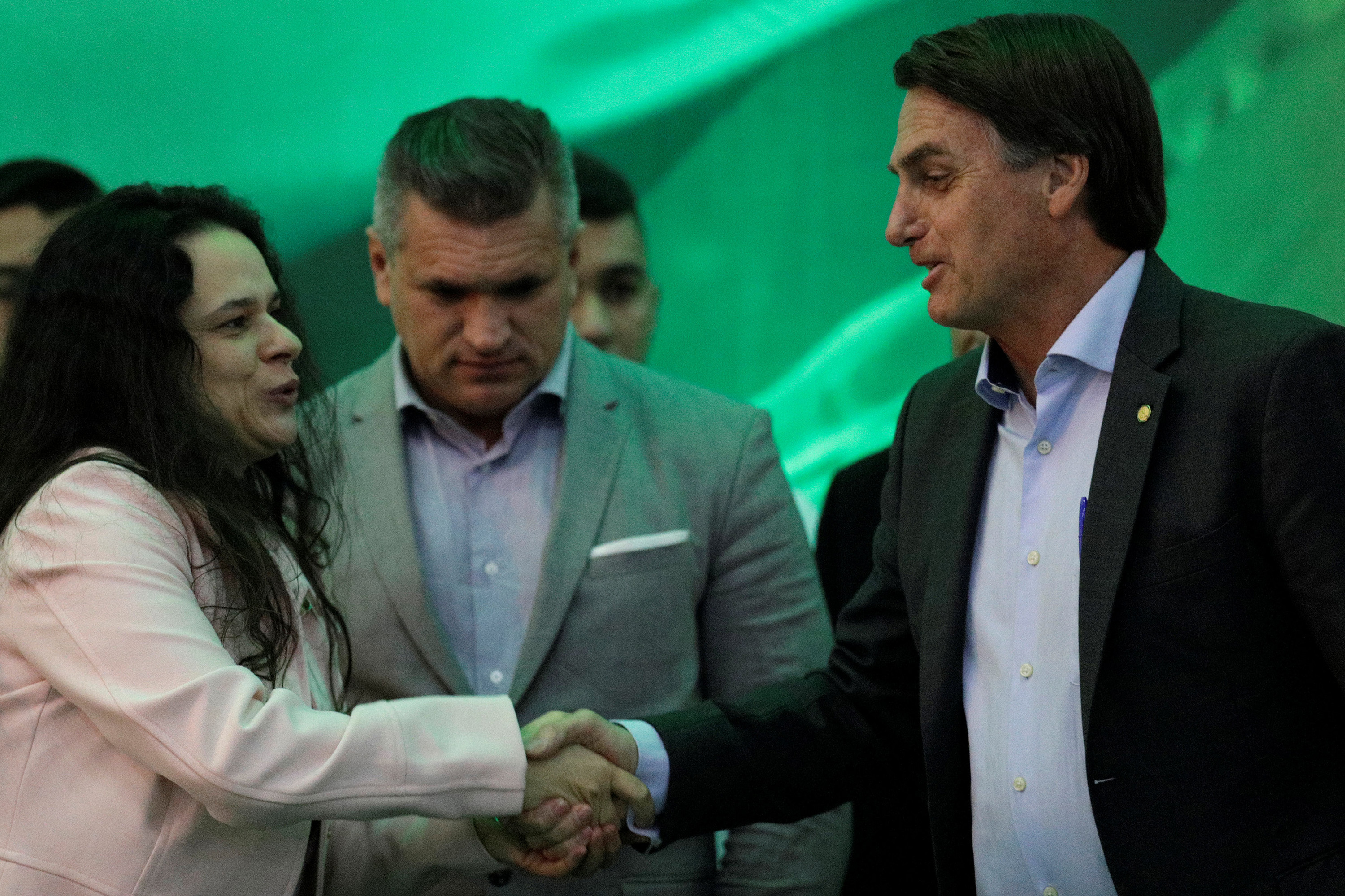 Federal deputy Jair Bolsonaro (R) greets Lawyer Janaina Paschoal (L) during the national convention of the Party for Socialism and Liberation (PSL) where he is to be formalised as a candidate for the Presidency of the Republic, in Rio de Janeiro, Brazil July 22, 2018. REUTERS/Ricardo Moraes