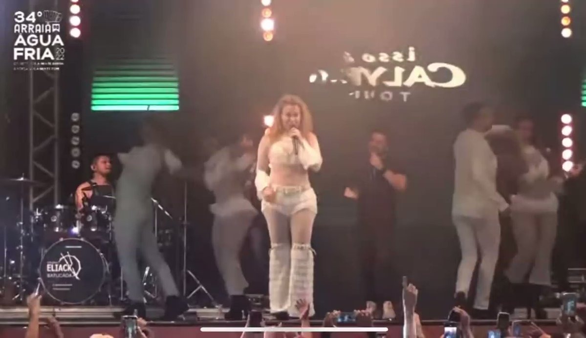 Joelma acabou levando um tombo no domingo, 19, durante seu show no 34º Arraiá do Água Fria, na cidade de Medeiros Neto, no extremo Sul da Bahia. Enquanto fazia a coreografia da música Anjo, a cantora se desequilibrou, escorregou e caiu de costas ficando com as pernas para cima. Mas ela não se abalou e seguiu cantando.