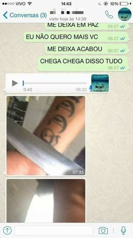 Patrícia alega que Bernardo lhe enviou fotos pelo celular com faca no pescoço, nos pulsos e no rosto, dando indícios de que poderia suicidar-se caso ela não reatasse o romance.